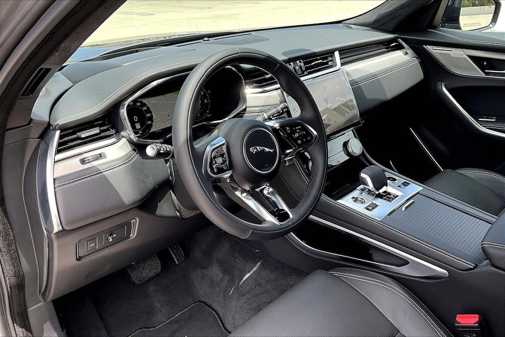 F-PACE P400 R-Dynamic S, 4D Sport Utility, 3.0L I6, 8-Speed Automatic, AWD, Eiger, Ebony/Ebony/Ebony w/Perforated Windsor Leather Seat Trim, 13 Speakers, 4-Wheel Disc Brakes, ABS brakes, Adaptive suspension, Air Conditioning, Alloy wheels, AM/FM radio: SiriusXM, Apple CarPlay/Android Auto, Auto High-beam Headlights, Auto tilt-away steering wheel, Auto-dimming door mirrors, Auto-dimming Rear-View mirror, Automatic temperature control, Brake assist, Bumpers: body-color, Compass, Delay-off headlights, Driver door bin, Driver vanity mirror, Dual front impact airbags, Dual front side impact airbags, Electronic Stability Control, Emergency communication system: Remote SOS Emergency Call, Exterior Parking Camera Rear, Four wheel independent suspension, Front anti-roll bar, Front Bucket Seats, Front Center Armrest, Front dual zone A/C, Front fog lights, Front reading lights, Fully automatic headlights, Garage door transmitter: HomeLink, Heads-Up Display, Heated door mirrors, Heated front seats, Heated Front Sport Seats, Heated steering wheel, Illuminated entry, Leather Shift Knob, Leather steering wheel, Low tire pressure warning, Memory seat, Navigation system: Pivi Pro (Connected Navigation), Occupant sensing airbag, Outside temperature display, Overhead airbag, Overhead console, Panic alarm, Passenger door bin, Passenger vanity mirror, Power door mirrors, Power driver seat, Power Liftgate, Power moonroof, Power passenger seat, Power steering, Power windows, Radio data system, Radio: Meridian 400W Sound System, Rain sensing wipers, Rear anti-roll bar, Rear fog lights, Rear reading lights, Rear seat center armrest, Rear window defroster, Rear window wiper, Remote keyless entry, Security system, Speed control, Speed-sensing steering, Split folding rear seat, Spoiler, Sport steering wheel, Steering wheel memory, Steering wheel mounted audio controls, Tachometer, Telescoping steering wheel, Tilt steering wheel, Traction control, Trip computer, Turn signal indicator mirrors, Variably intermittent wipers.